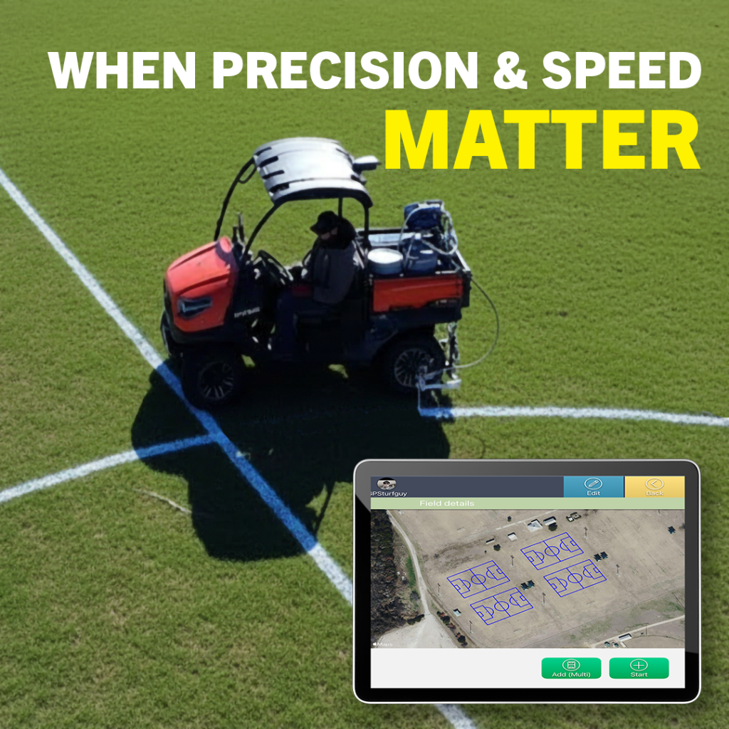 Our premiere athletic field GPS paint system. Featuring: Graco™ XT495 electric painter, sportstraq™ GPS, poly roof, power steering, & turf tires.