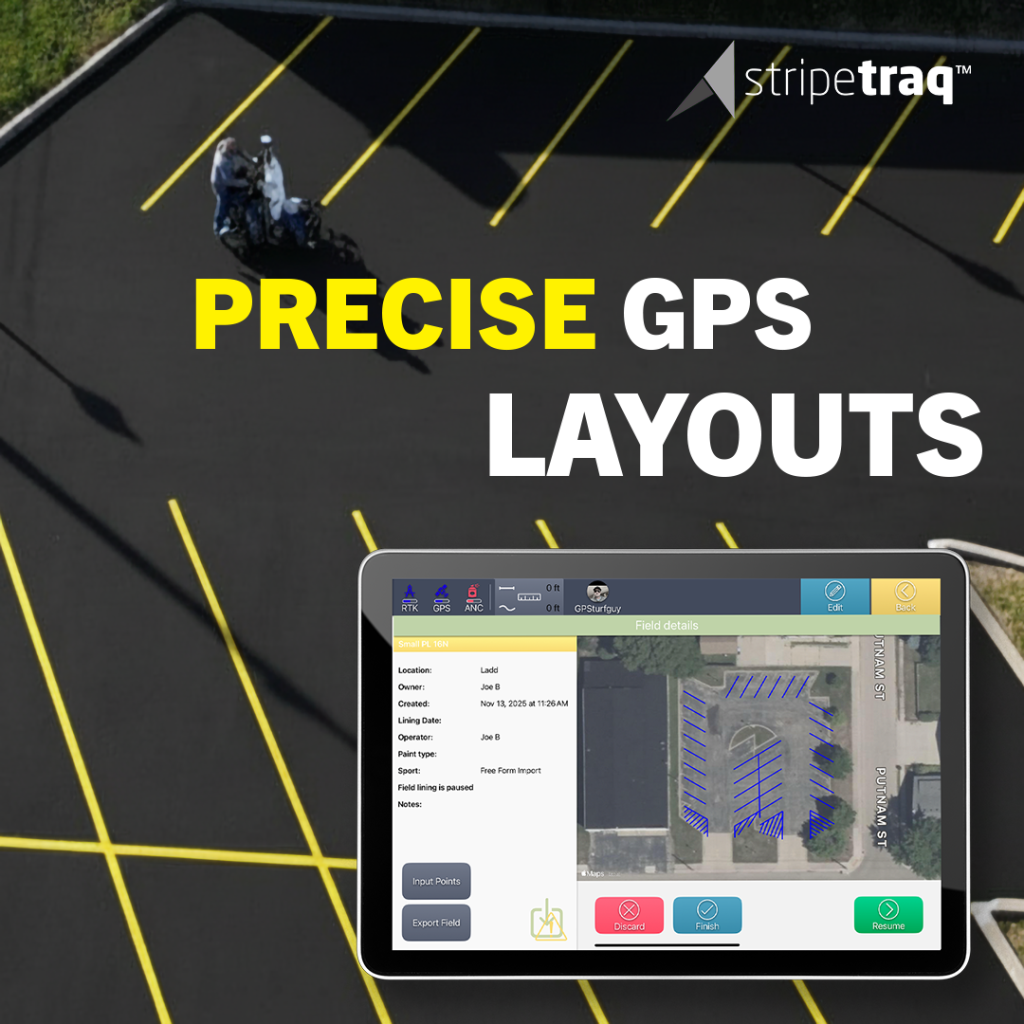 Sportstraq™ for athletic fields & Stripetraq™ for pavement. Traqnology offers a streamlined user layout making employee training and operation a breeze. Layout paintable objects in the field using built-in templates or upload completely custom jobs out of CAD. Once an object is laid out it is ready for over-marking.
